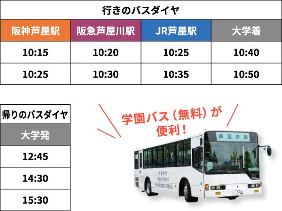 来学の際は学園バスまたは学内駐車場をご利用ください。 ■駅から芦屋大学学園バスまでの行き方